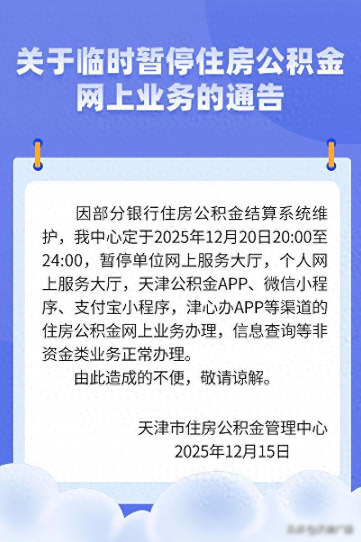 12月15号晚上,天津公积金中心发布通知,提到12月20号晚上八点到十二点,所有线上服务都会关闭,手机APP、微信小程序、支付宝入口和津心办都包含在内,这次操作距离执行只有四天时间,没有提前告知用户,也没有说明应急措施,让人看了着急,这不像系统升级,更像是突击检查。