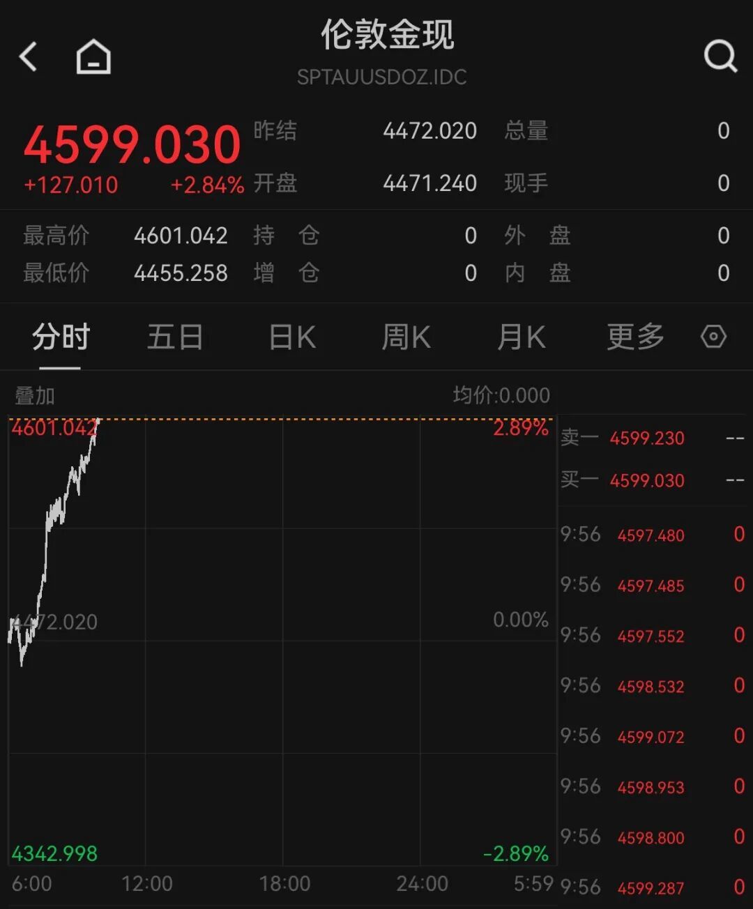 3月25日盘中,现货黄金一度升破4600美元关口,截至发稿,日内涨2.84%,报4599.03美元/盎司。