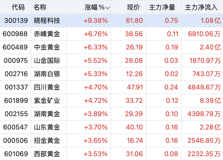 黄金股今日同样大涨,截至发稿,晓程科技涨超9%,赤峰黄金、中金黄金涨超6%。